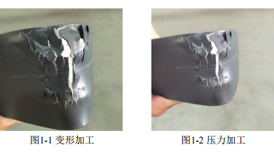 長期以來,不論是傳統(tǒng)的“有鉻鈍化”處理還是新興的“無鉻鈍化”處理,噴涂后的鋁型材 存在的共性問題是難以滿足較大變型加工和較大壓力的加工過程。(如圖1-1、圖1-2所示)